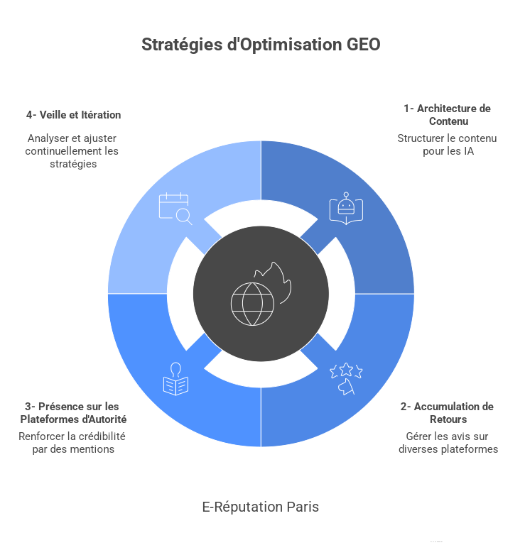 Une fois les vulnérabilités identifiées, trois leviers d’action : enrichir massivement les sources positives (témoignages clients, études de cas, contenus d’expertise), neutraliser les sources négatives (demandes de suppression, activation du droit à l’oubli RGPD), optimiser vos contenus pour le GEO (Generative Engine Optimization) avec des formats structurés que les IA privilégient.
